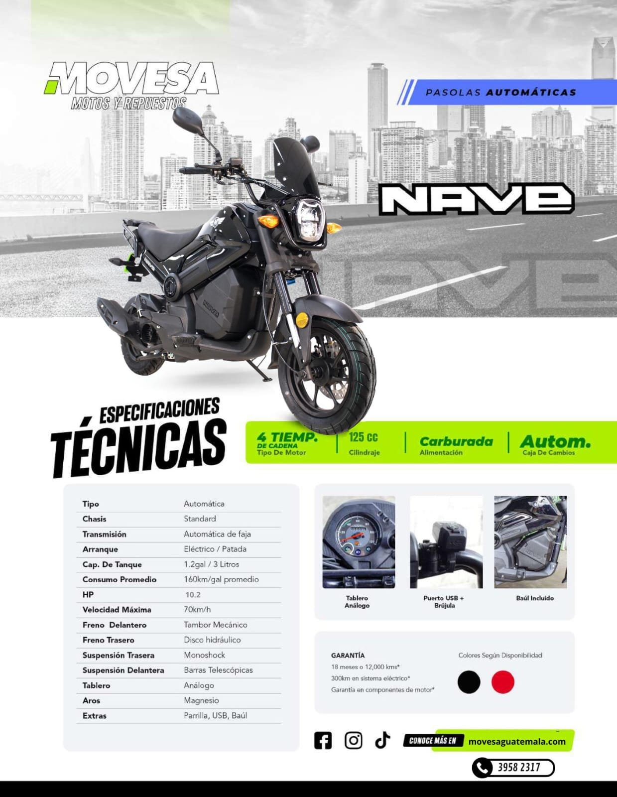 | Los precios en nuestra tienda en línea son precios con descuento incluido al contado. Todas nuestras motocicletas tienen descuentos en compras al contado, estrictamente en efectivo, transferencias o depósitos bancarios; compras en visa cuotas no aplican a descuento según políticas en: Políticas Movesa Guatemala |